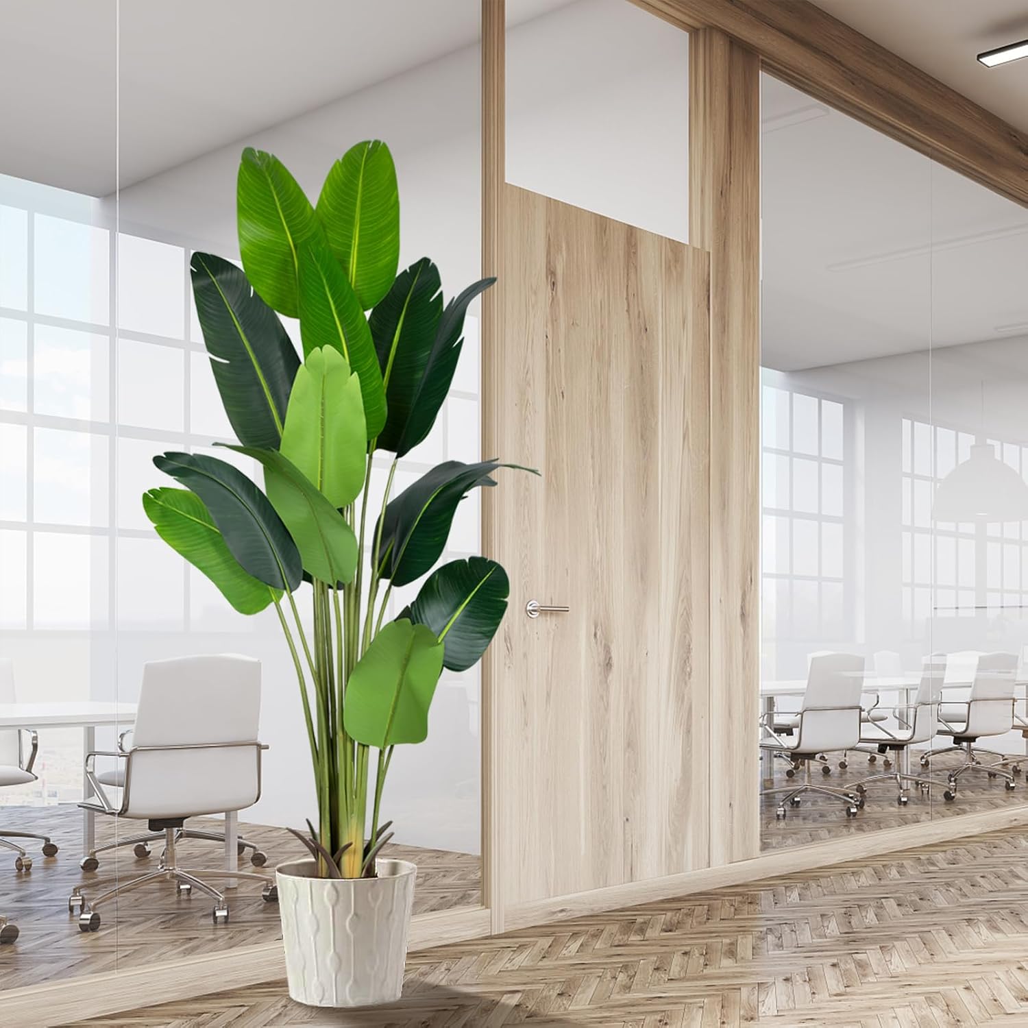 - 【No Need Styling Fake Tree】Artificial plant is easy to assemble in 5 minutes. No need styling, just insert the leaves into the holes, and you can get a sight of green immediately. The fake bird of paradise branches are adjustable and you can easily rearrange them according to your preferences. When removing items from the box, please adjust the branchto the outside, to achieve the effect in the picture.
