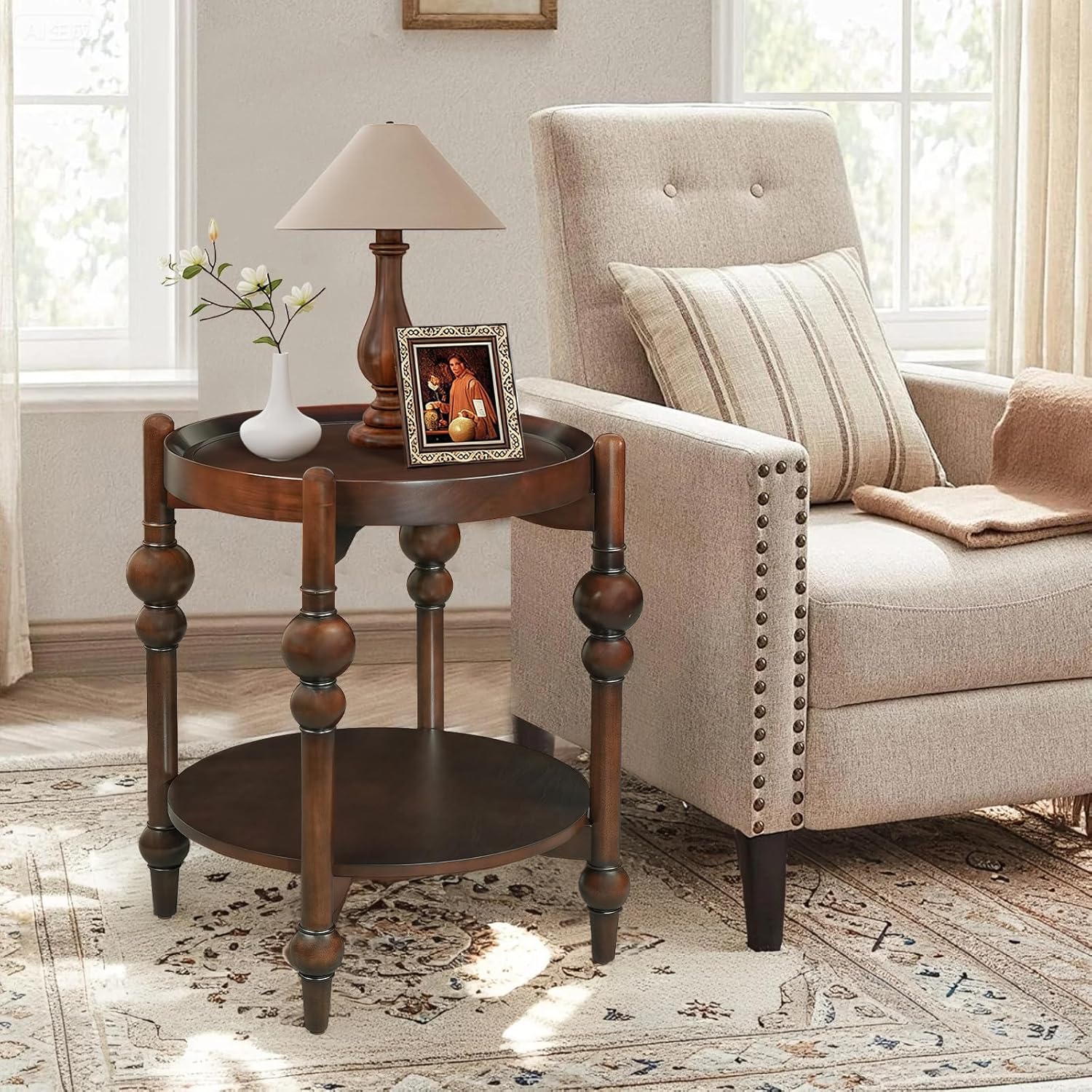 - Dual-Layer Functionality for Maximum Storage: Side table features a two-tiered design, the top and lower circular tray with real wood veneer provides a stable surface for drinks or decor, while the lower open shelf stores books, or decorative items. The deep edge on the top tray prevents spills or items from slipping off